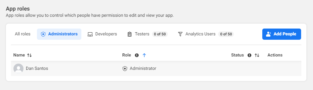 Open the Facebook Roles page by navigating to App Roles > Roles.