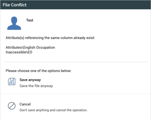 When saving a newly-created database column attribute, and an existing database column attribute referencing the same column already exists anywhere in the RPI file system, the following File Conflict dialog is shown: