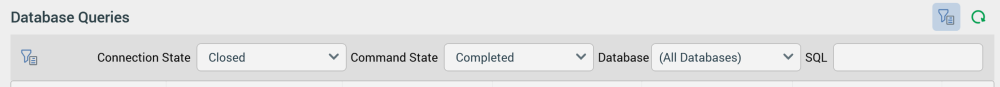 Following execution of a search, any matching queries are listed in the Database Queries grid. If no matching entries exist, a message is displayed. Log entries are ordered by date. For each log entry, the following properties are displayed: