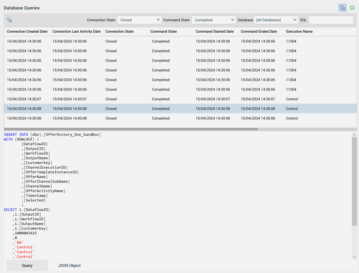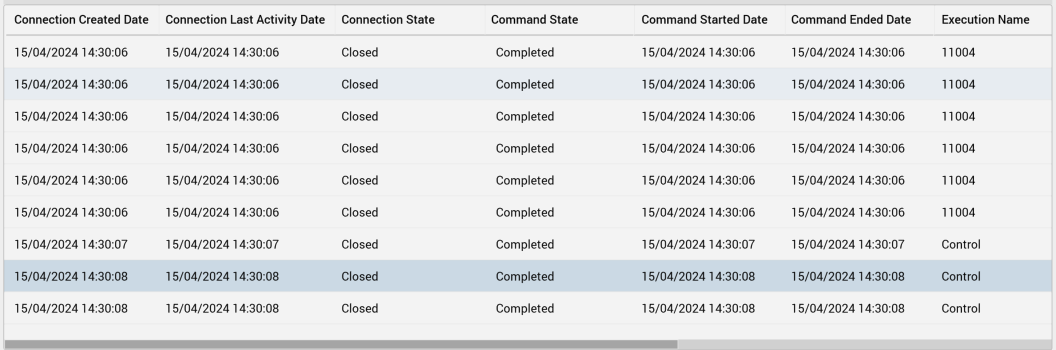 Cancel Command: this option is displayed on hover, It is protected by an βAre You Sure?β dialog. It is only available when you have the Operations β Database Query Log β Cancel Command functional permission. Clicking the button sends a request to the database to cancel the command, displays an informational message, refreshes the grid and generates an audit record.