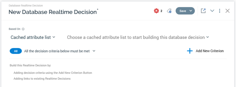 Note that selection of a cached attribute list or Realtime cache offer is simply a mechanism to be used when adding decision criteria to a database decision – both are, after all, just vehicles for the population of data within the Realtime cache. If required, you can include decision criteria based on cached attribute list and Realtime cache offers in the same database decision.