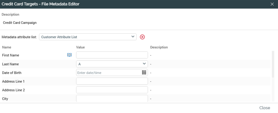 Metadata attribute list: this dropdown list allows you to select a configured attribute list, which defines the set of metadata attributes in respect of which values can be captured for the file. Initially, a list is not selected, and you must select an attribute list in order to specify metadata attributes for a file.