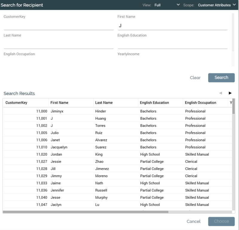 Choose: this button is available when a record is selected. Clicking it displays the Recipient Email Preview overlay (see below).