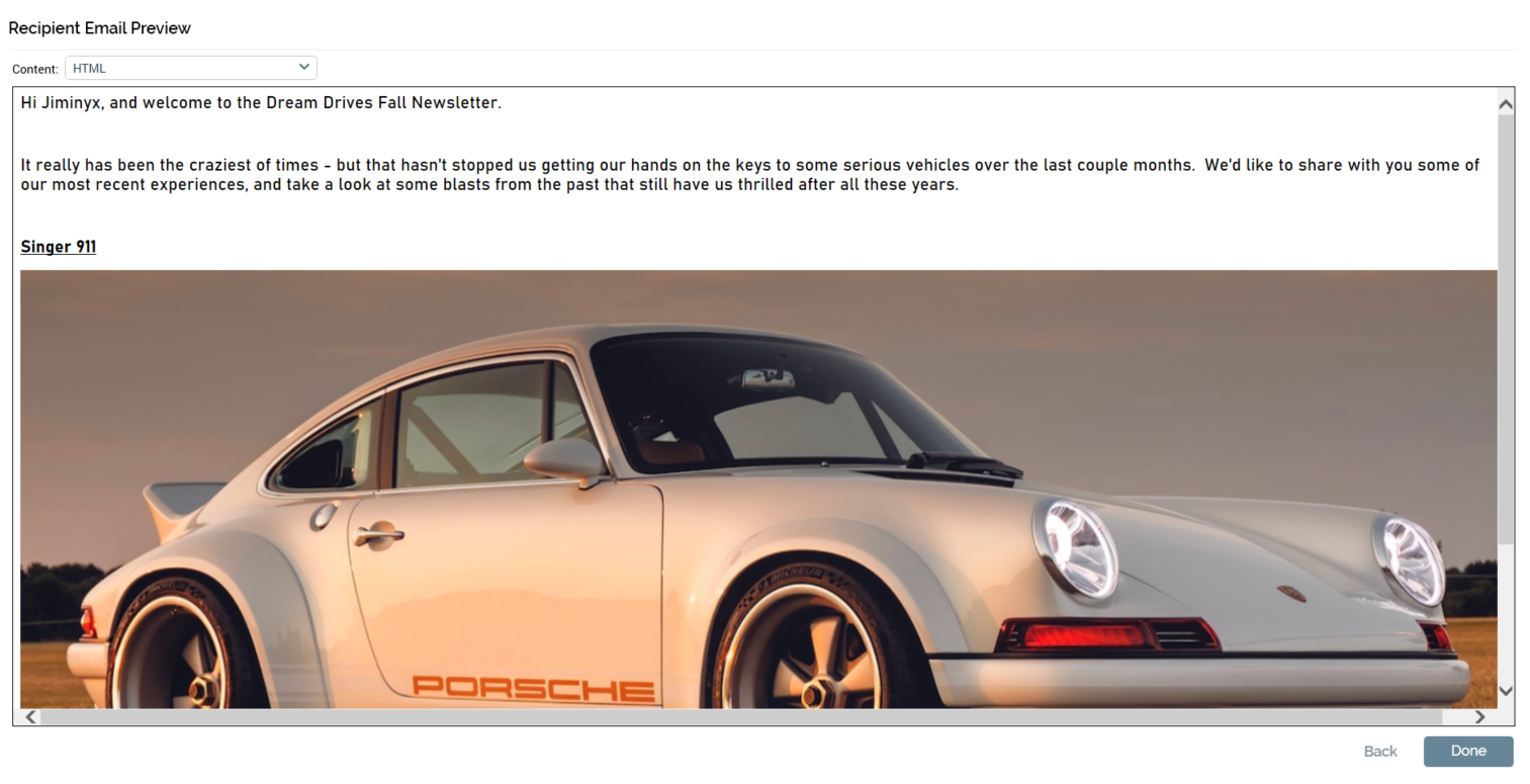 Rendered email content: customized in accordance with the selected record.