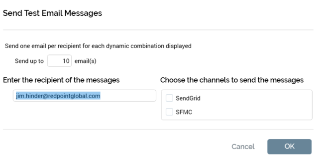 Cancel: removes the dialog from display and abandons sending the test emails