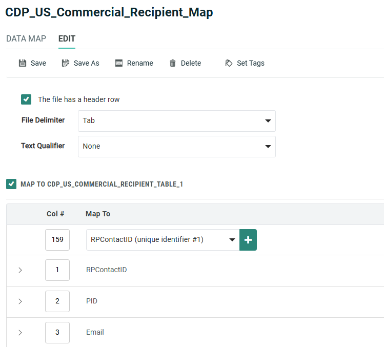 Make sure that the File Delimiter option is set to Tab delimiter in the “The file has a header row” option. The Text Qualifier must be set to None by default.