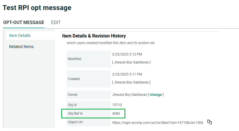 To retrieve the Opt-Out Message ID, go to the Opt-Out Message tab and look for the Obj Ref Id field. Use the corresponding value of the field when provisioning the Marigold channel connector in RPI.