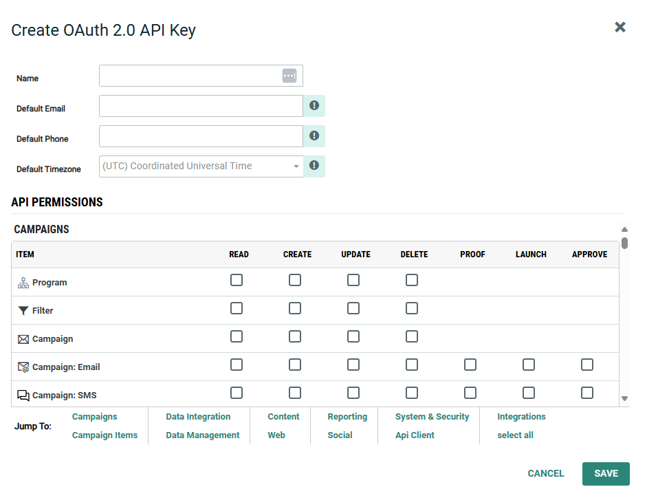 Supply all mandatory fields as required by Marigold in creating a new OAuth 2.0 API key.