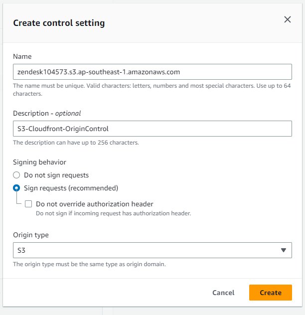 In your CloudFront configuration settings, select Create control setting.