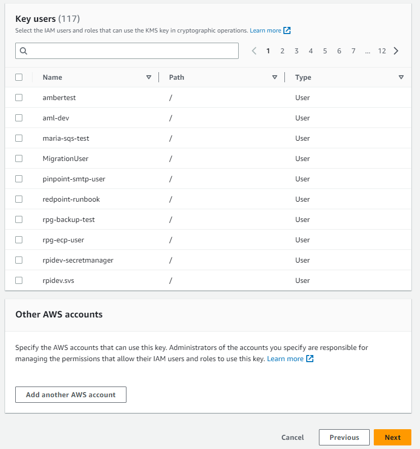 Select the boxes of users and roles who can encrypt and decrypt data when using AWS services.