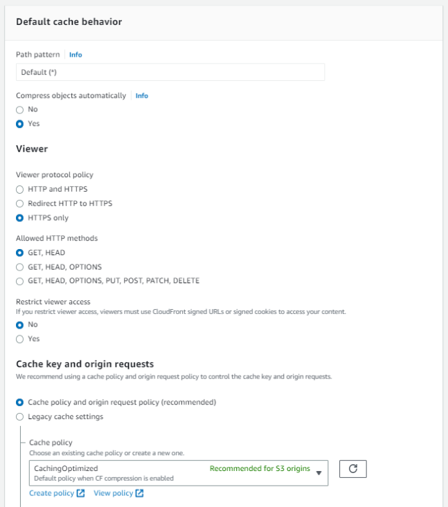 Set CloudFront Cache behavior settings. See the following example: