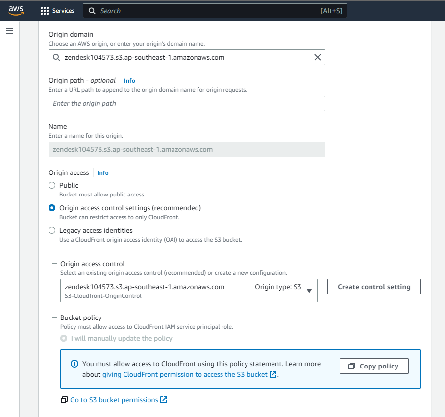 Copy the generated CloudFront Origin Access Control (OAC) policy as per the example below: