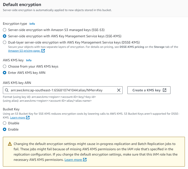 Follow the steps below to enable KMS encryption at an S3 bucket.