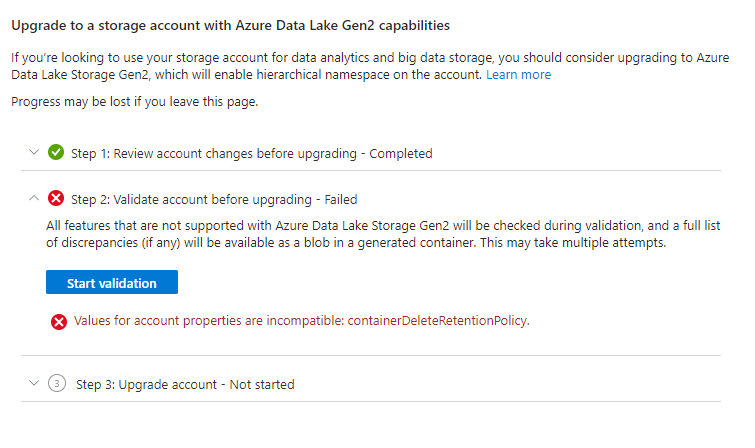 If you get the validation error below, go to Data Protection and disable “Enable soft delete for blobs” and “Enable soft delete for containers”.