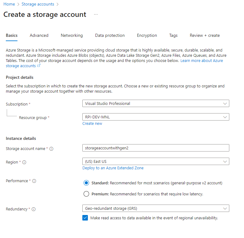 On the Advanced tab, check the Enable hierarchical namespace box.