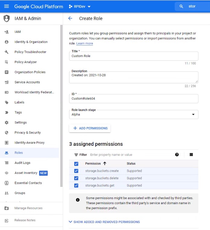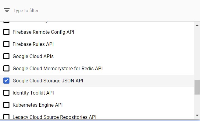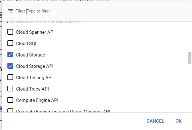 In the Permissions dialog, filter for “storage.buckets”. Check the following permissions: