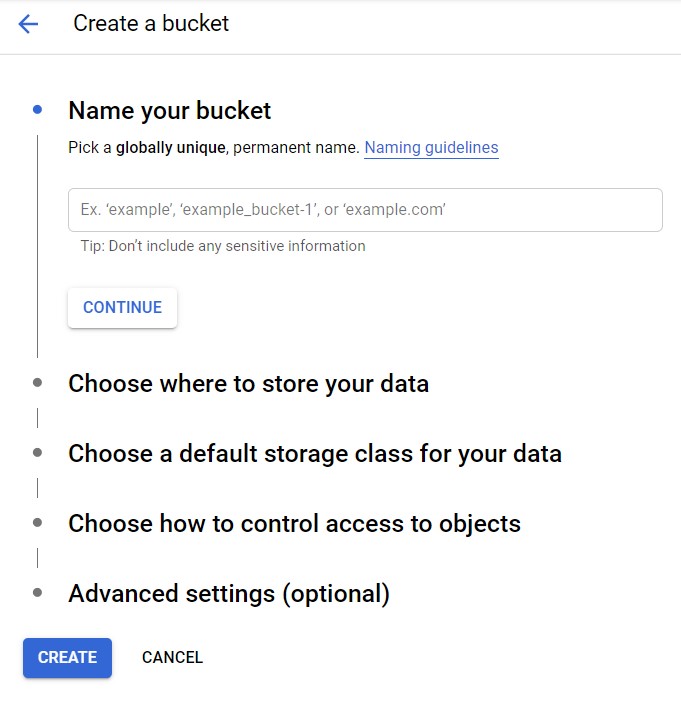 This section describes how to create and configure a new Google Cloud Storage Bucket. Please follow the steps below: