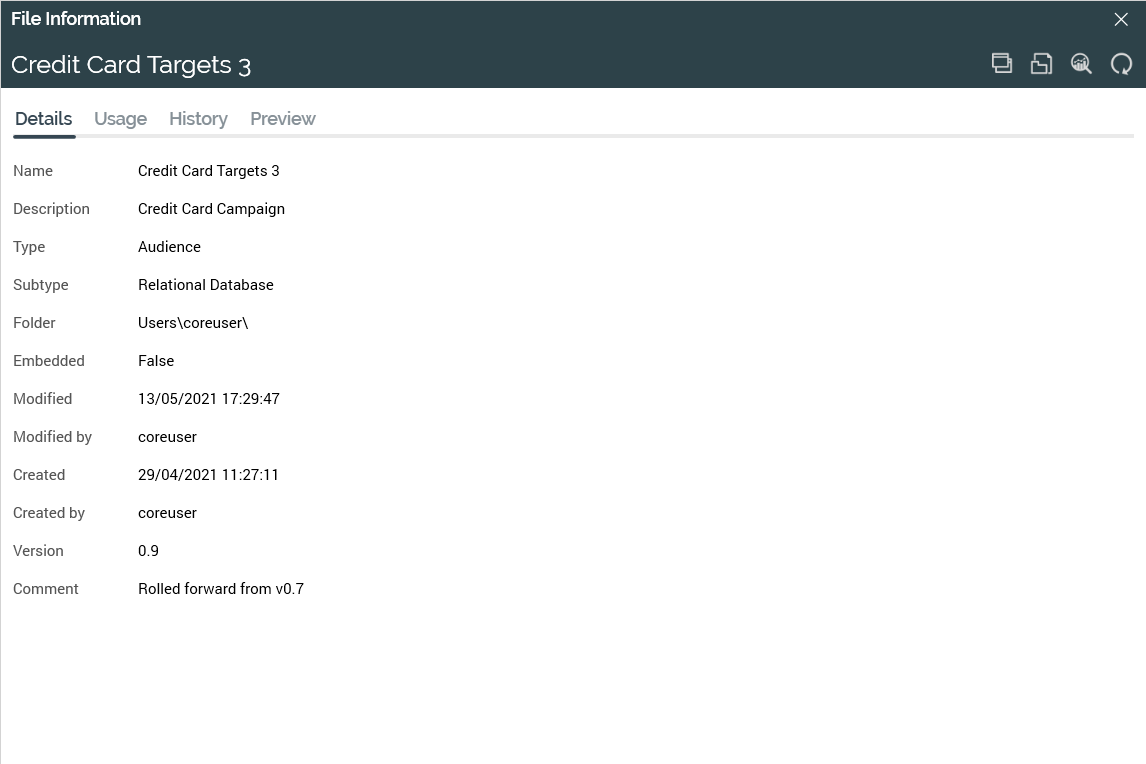 Open This Version: this option is only available for file types for which opening of previous versions is permitted. Invocation displays the version displayed in the File Information Dialog in an appropriate designer instance.