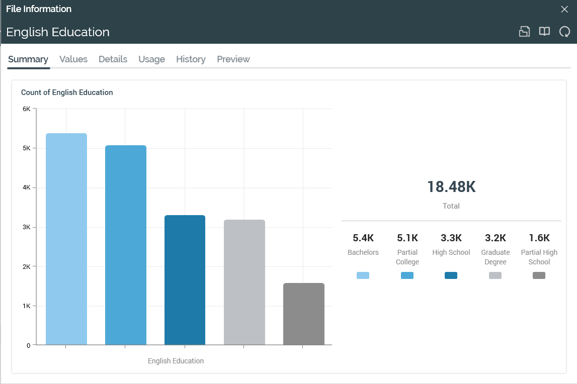 Displayed only for an attribute, this tab displays a graphical breakdown of its distinct values.