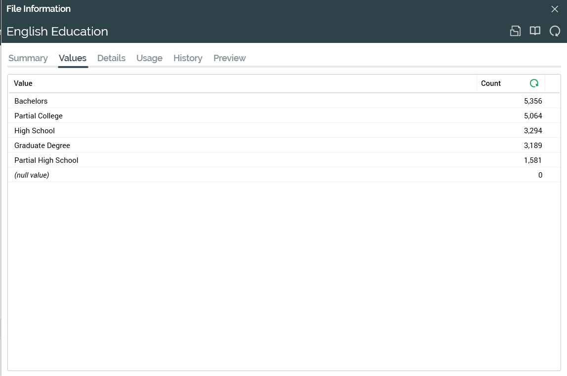 Displayed only for an attribute, this tab lists its values and the counts thereof in a grid.