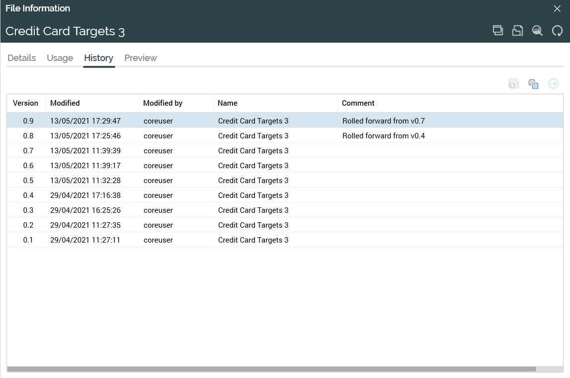 Roll the selected version forward to become the current version: you can roll forward a previous file version so that it becomes the latest. You cannot roll forward the current version. Following invocation, an ‘Are you sure?’ dialog is displayed. If you elect to proceed with the roll forward, a new version is created, exactly as per the selected historical version, but with an incremented version number. The new version is displayed at the top of the list of file versions within the History dialog. A message is shown to advise of the roll forward’s success.