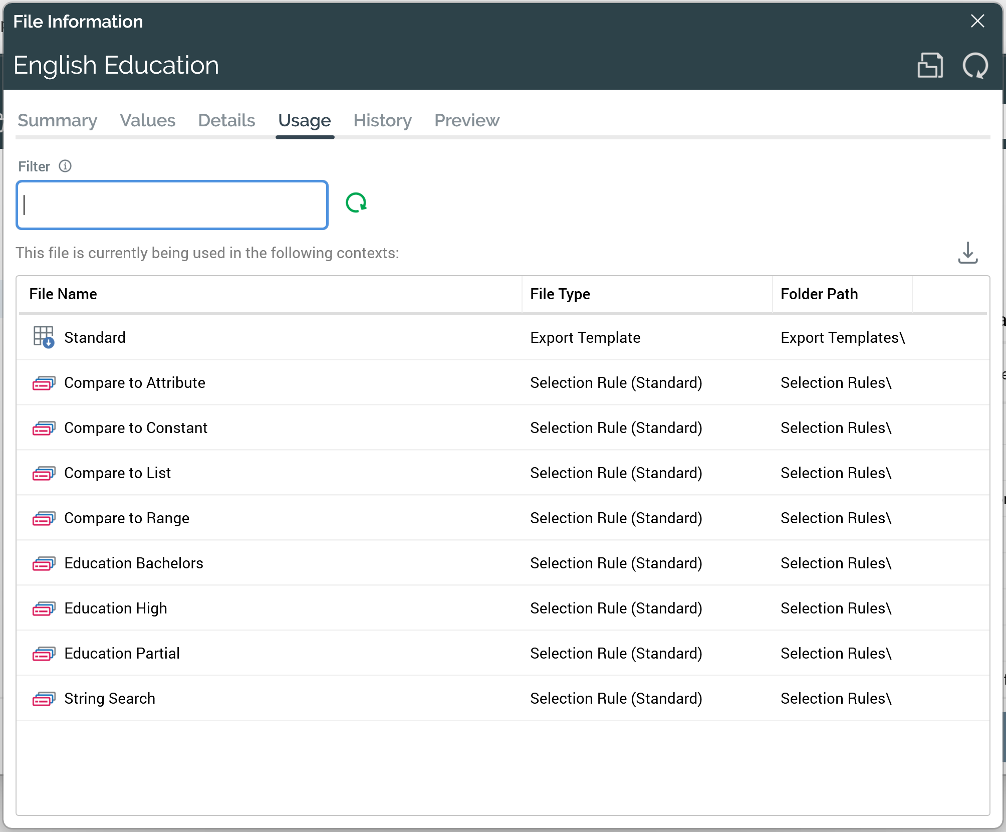You can specify a value by which to filter the list of files being displayed in the Usage tab. The field provided to do so is data type-specific. Clicking the Apply Filter button to the right applies filter; the list is filtered to show only standard selection rules in which one or more compare to constant or compare to list criteria reference the supplied filter value. Clicking the main toolbar Refresh button removes any applied filter.