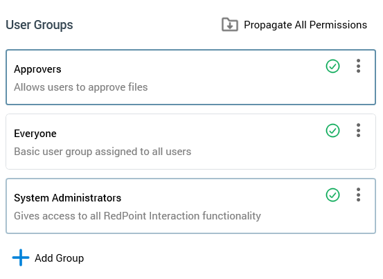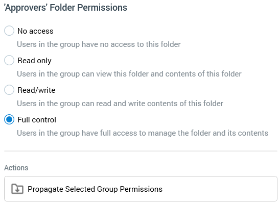 Propagate Selected Group Permissions: invocation of this option allows you to propagate the selected group's permissions to all child folders to which you have full control access. Invocation propagates any relaxed permissions in respect of the selected user group only.