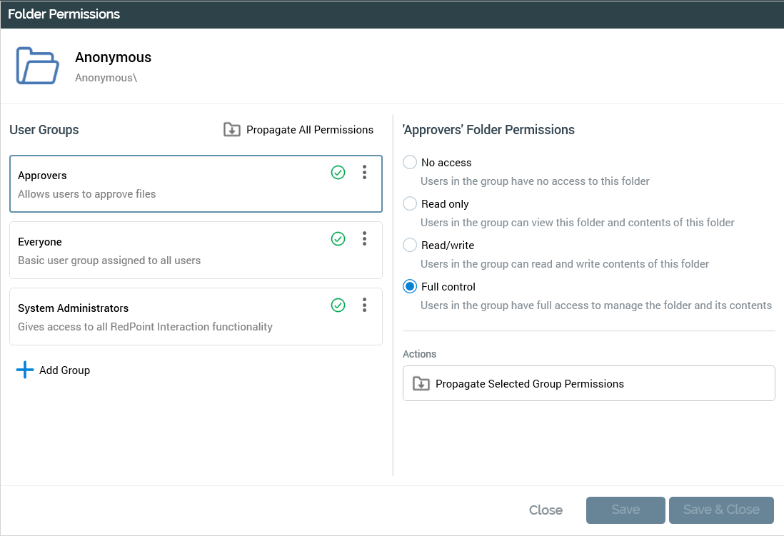 Save & Close: this button saves changes made in the Folder Permissions dialog and removes the dialog from display. It is only enabled if you have Full control within the current folder.