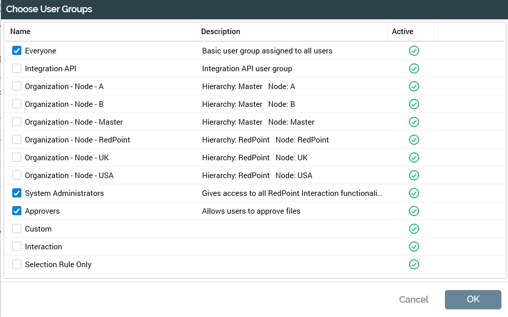 Note that organization node user groups are included in the list. This means that you can restrict access to folders within the file system based on users’ organizational node membership; for example, a user associated with the ‘Banking’ node might be precluded from viewing the contents of a folder associated with the ‘Insurance’ node.