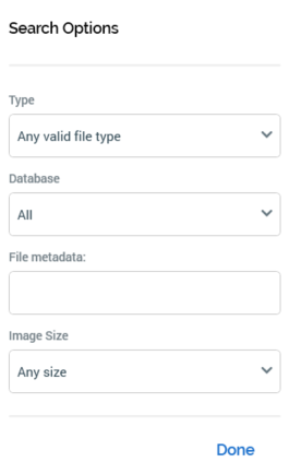 Image Size: If you specify an explicit image size, non-image asset files that match other search criteria are not returned; when you set Image size to a value other than Any size, the Type field is set to a read-only “Image assets only”. This dropdown field exposes the following options: