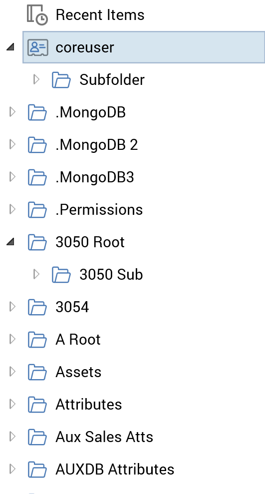 The Recent Items special folder is displayed as the first folder in the folders treeview.