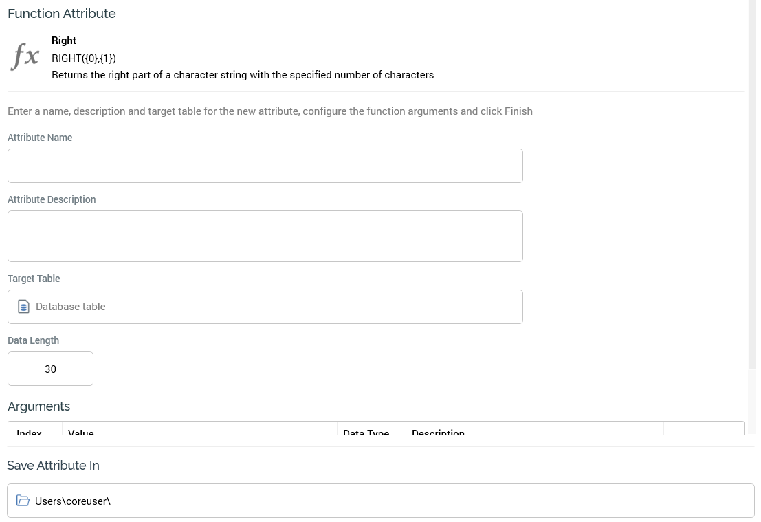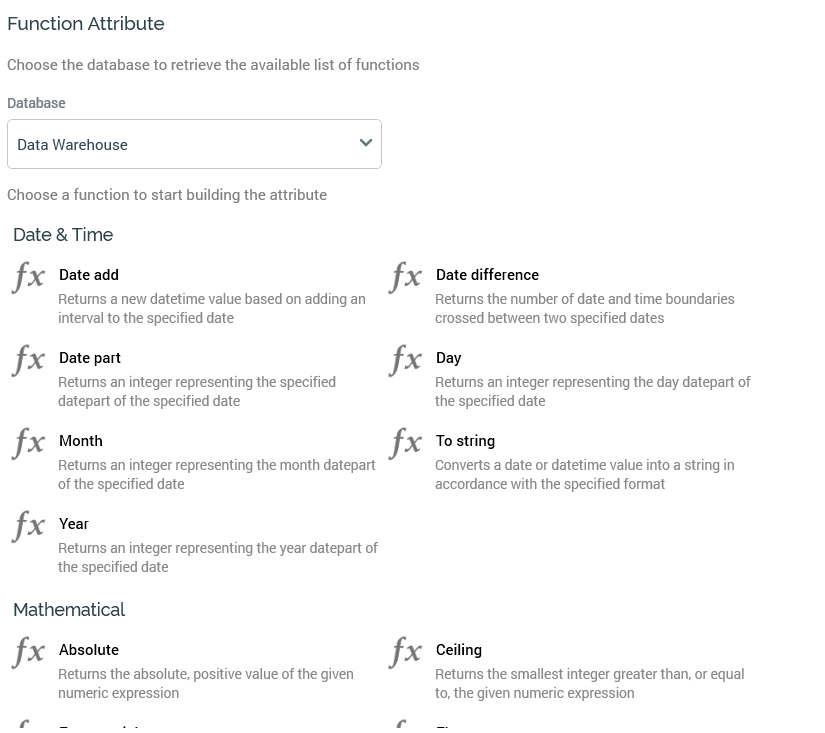 The list of functions available to you when building a function attribute differs based on the type of database in respect of which the attribute is to be created.