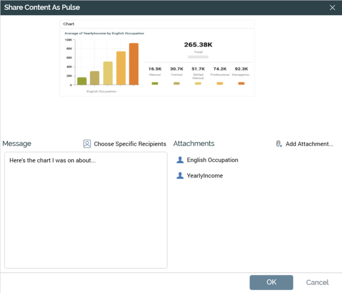The Share as Pulse button is shown at the Chart, Count Results and Channel Overview widgets. Selecting it displays the Share Content as Pulse dialog, which allows you to share details of the widget, including a visual representation of its currently-displayed state, a message and file attachments, as a Pulse.