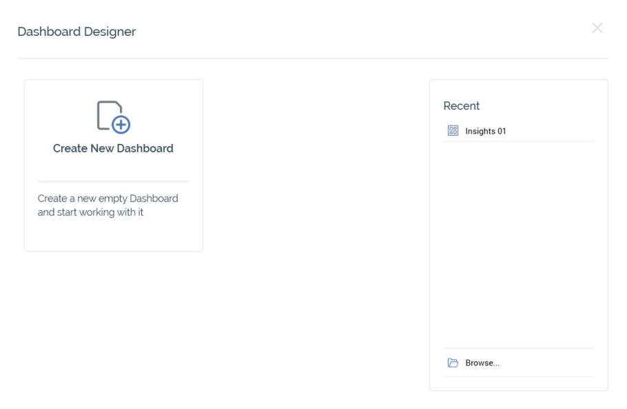 Create new Dashboard: selecting this button displays the Dashboard Designer Start Page. A close button is shown to its top right; selecting it removes the overlay from display. If a dashboard containing unsaved changes is displayed at invocation of Create New, an “Are You Sure?” dialog is shown, from which you can: