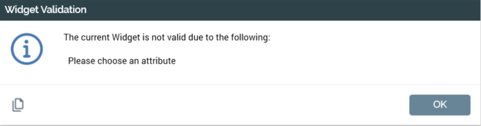 A validation status indicator is displayed to the right of the dashboard’s name, and at certain widgets’ footers. When the dashboard or widget is valid and contains no validation errors, the validation status indicator is shown as a blue checkmark icon.