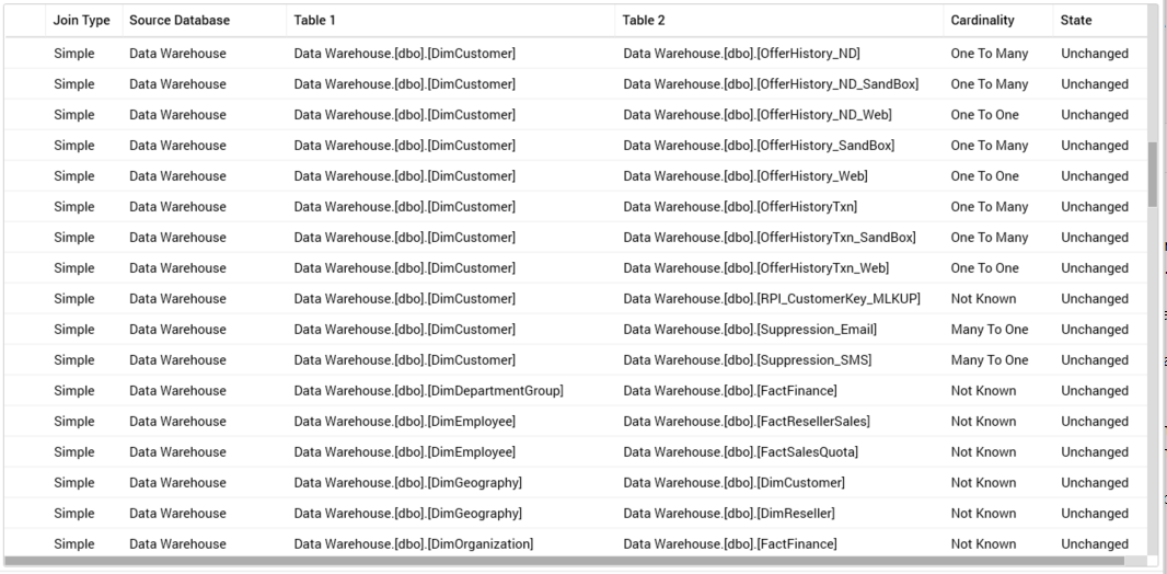 Cardinality: this property is only available for simple joins and is unavailable for multiple joins. A simple join’s cardinality defines the relationship between records in one of the join’s tables and records in the other…for example, Customer and Orders tables might have a One to Many cardinality (a given customer might have several orders). Cardinality is set using a dropdown that exposes the following values: