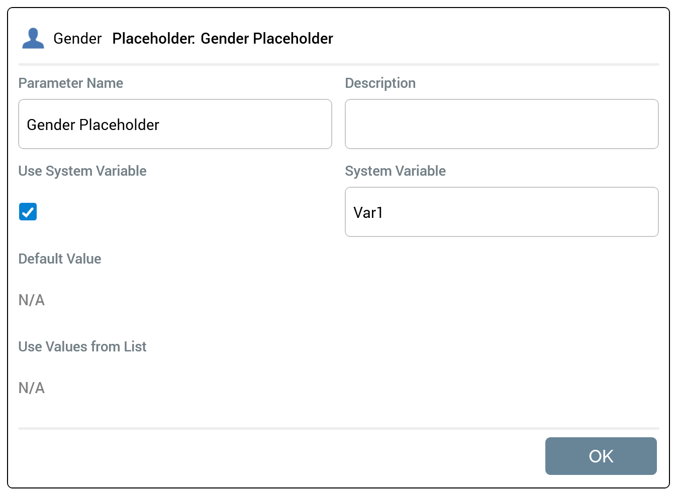 Use Sys Variable: this checkbox is unchecked by default. When checked, the Sys Variable property is available, and Default Value, Use Values from List are unavailable.