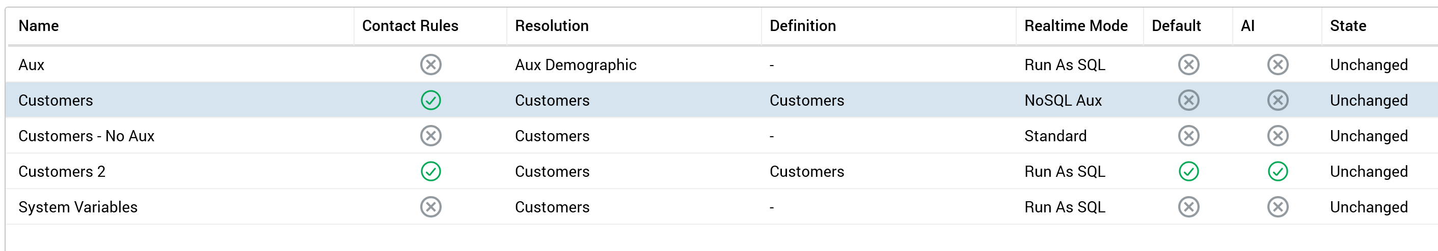 Enable contact rules: selecting this value makes contact rules available at basic selection rules using the current definition. Contact rules allow you to target on the basis of an individual having previously been contacted via RPI. When selected, an Audience definition property replaces Resolution level, and Base Definition is not shown. Note this option is not available when configuring SQL database definitions in a NoSQL data warehouse/SQL auxiliary database environment.