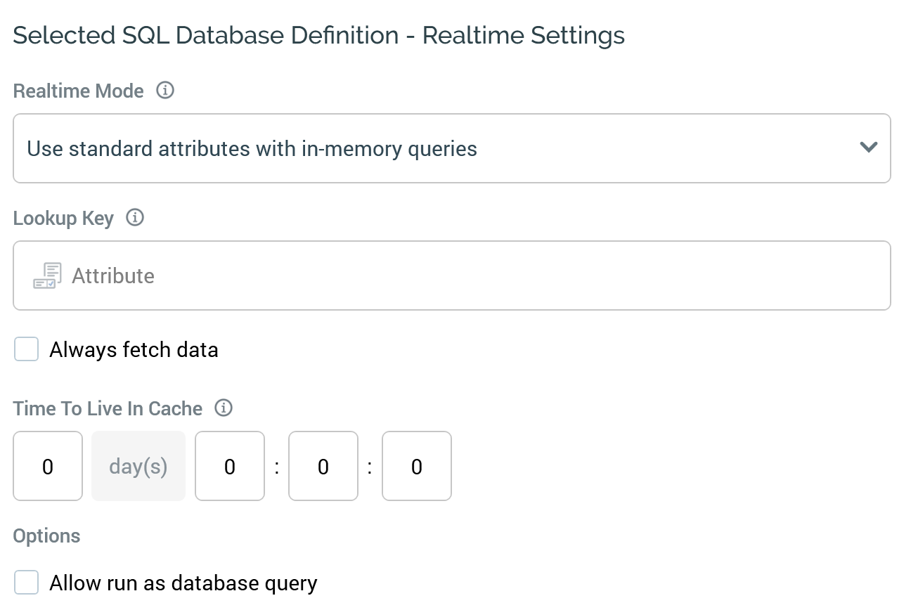 Allow run as database query: this checkbox is also only when Realtime mode is not set to "Run as SQL". It is unchecked by default. It allows you to specify whether a rule can run as a database query if Realtime attribute mappings are missing. When checked, if attributes used in a rule are unmapped (thereby preventing direct querying of the cache), RPI will query the database directly.