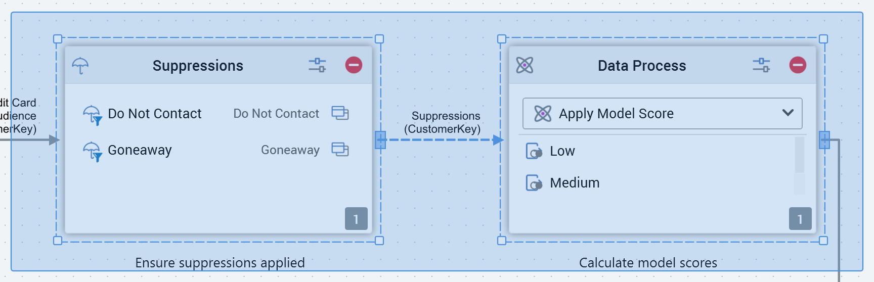 Data Process Projects: any data process Projects configured at the current RPI tenant that have their Show in toolbox properties set are listed. You can drag a data process project from the toolbox and drop it onto the Audience Designer workspace, creating a data process block with a pre-configured Data process project property.