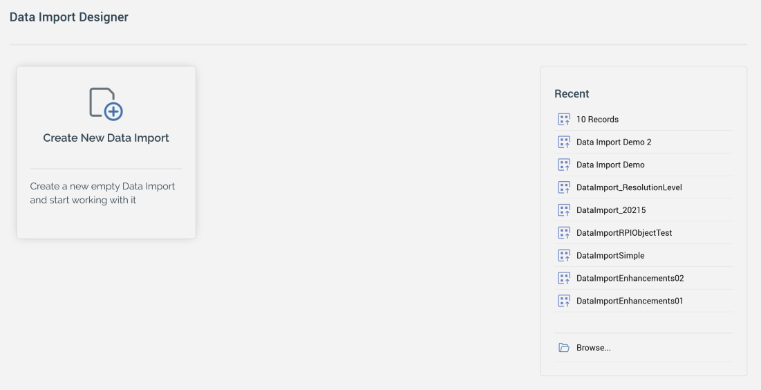 The Data Import Designer Start Page is shown upon invocation of Data Imports at the quick access menu, and also on selecting Create new Data Import at the Data Import Designer toolbar.