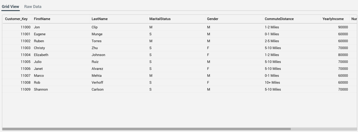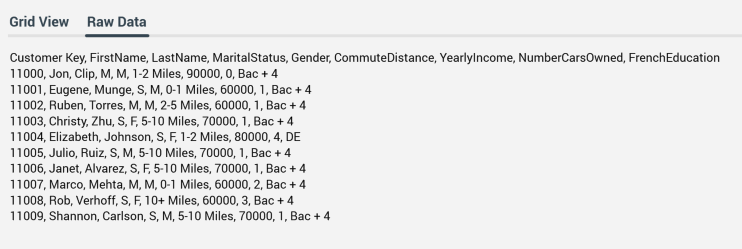 Data is previewed in the "File Preview - [Filename]" dialog. The first [n] rows are shown (where [n] is defined by system configuration setting DataImportPreviewRowsMax). Two read-only tabs are shown in the dialog:Grid View