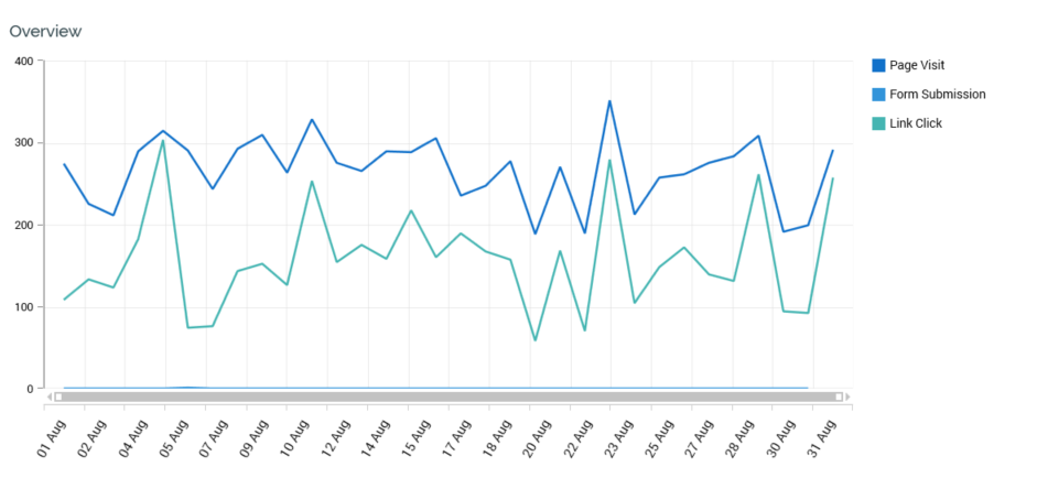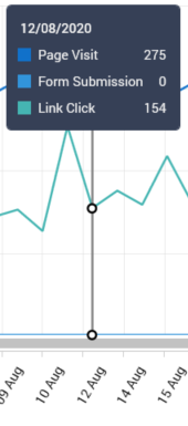 This section contains a line chart, which displays time series values relating to metrics gathered in respect of published landing pages across the currently-specified date range.