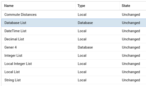 List: containing updateable Label and Value columns. On creating a new local list, a single list item is present therein. Its Label property is set to “Label” (this can be incremented to ensure uniqueness). Its Value is blank. At least one list item must be defined.