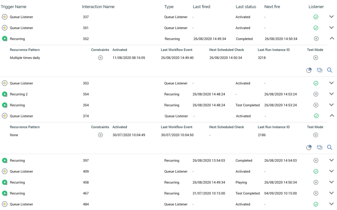 The triggers list is displayed below the header and lists all Active interaction triggers that have yet to fire, and which match the currently-specified filter criteria.
