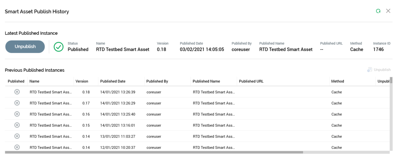 You can unpublish a smart asset in the History dialog, using the toolbar button provided. When you unpublish a smart asset, if the asset’s content had been published to a web publish location, it is deleted. Cached asset details are not affected by unpublish. An audit record with Audit Type “Object Execution” and Audit Sub Type “Smart Asset Unpublish” is created.