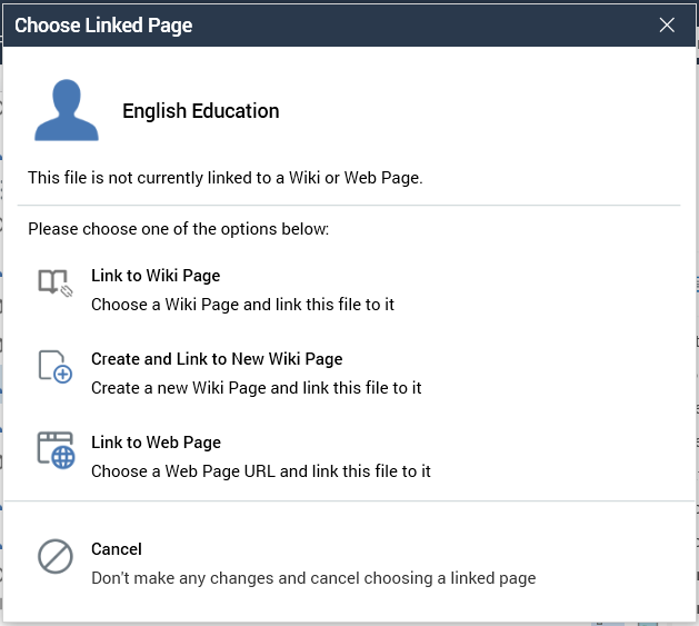 You may cancel selection of a Wiki page; this resets the File System Dialog’s title and retains the button’s text as Link to Wiki Page. The Clear the link to this Wiki page button is not displayed.