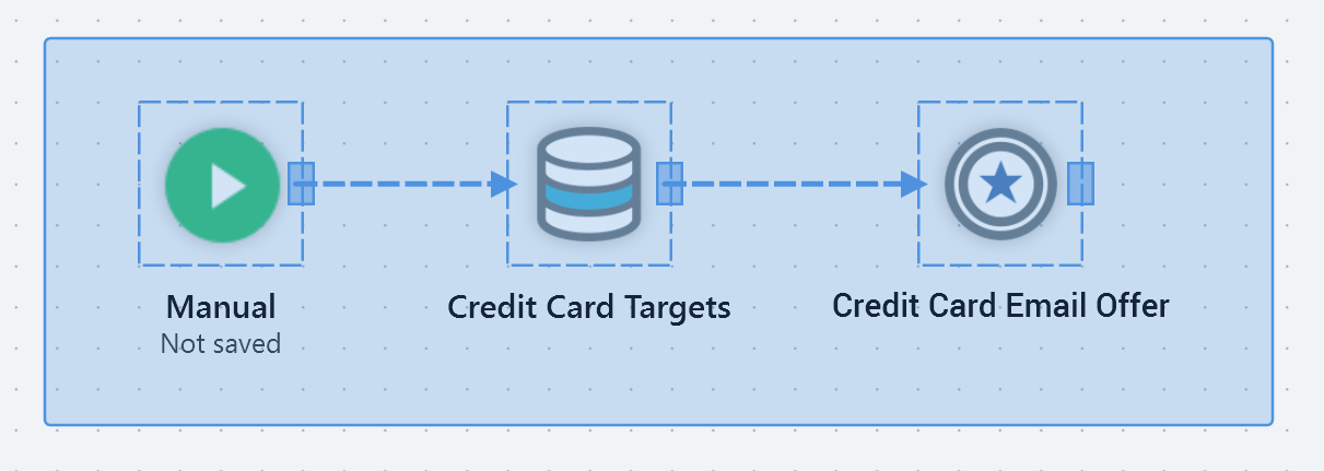When you drag a file from the bottom (search/folders) section of the toolbox and drop it onto the workspace, a pre-configured activity of the relevant type is added (e.g. dropping an offer onto the workspace creates a new offer activity). You can also drag a file and drop it onto an activity of an appropriate type to configure the activity (e.g. dropping an audience onto a batch audience configures the batch audience with the template).