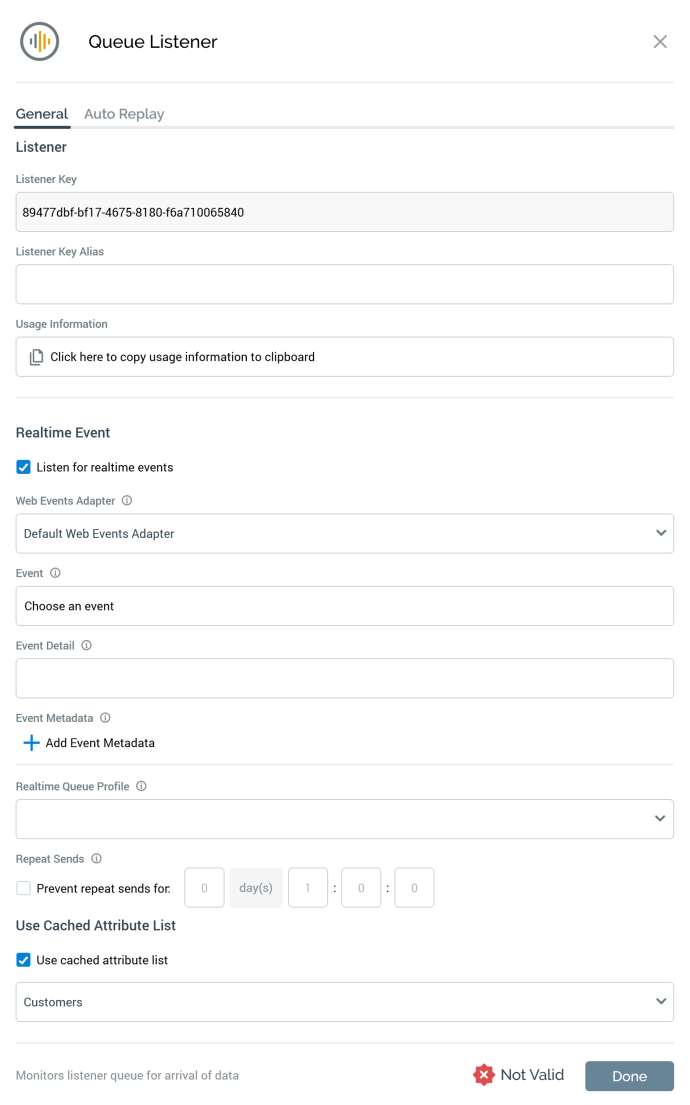 Listen for Realtime events: this checkbox is unchecked by default. When checked, the properties below it are shown.