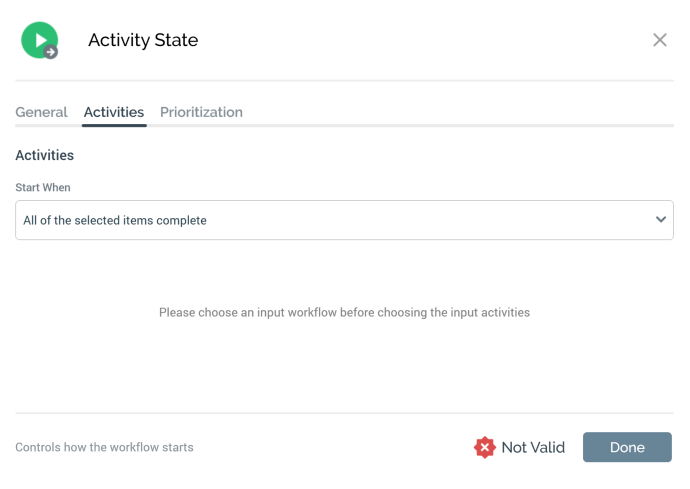 Start when: defines the type of conditions within the input workflow that must be met before activity state execution can begin. The dropdown exposes the following values: